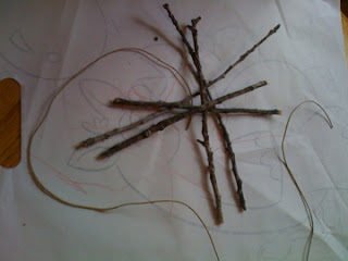 Assemble a simple star shape with the sticks and wrap the twine around and between sticks until the desired design is reasonably secure.